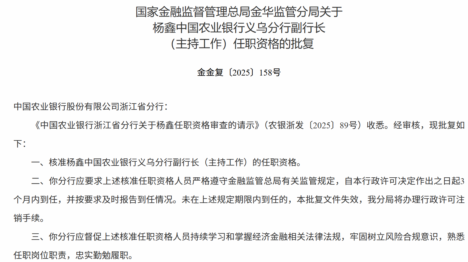 12月26日,国家金融监督管理总局金华监管分局发布关于杨鑫中国农业银行义乌分行副行长(主持工作)任职资格的批复,核准杨鑫中国农业银行义乌分行副行长(主持工作)的任职资格。